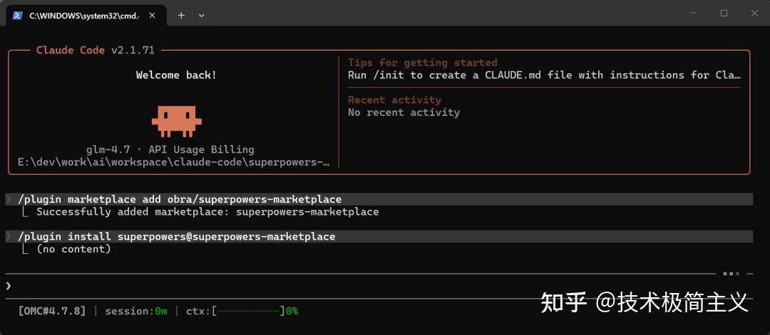 /plugin install superpowers@superpowers-marketplace安装完成后,重启 Claude Code,就可以使用了。